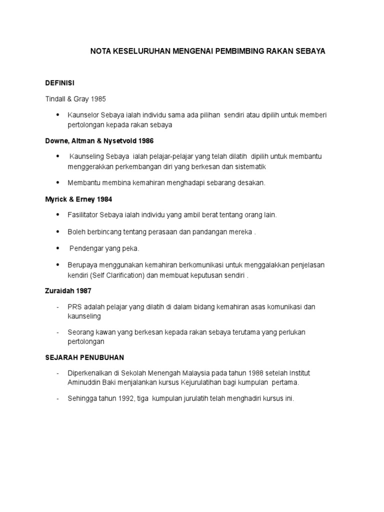 ISU-ISU STRATEGIK MATLAMAT STRATEGIK. Sesungguhnya modul pembimbing rakan sebaya yang dihasilkan kumpulan guru bimbingan kaunseling yang merangkumi aspek kemahiran interpersonal kemahiran kepimpinan kemahiran menyelesaikan masalah kemahiran membuat keputusan kemahiran kaunseling asas dan juga penilaian dapat membantu pihak kementerian pelajaran malaysia dalam proses membentuk. Mula diperkenalkan di sekolah-sekolah secara tidak formal dalam tahun 1986.