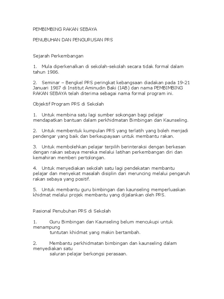 Kemahiran yang dimiliki itu diharap dapat menjadikan diri mereka sebagai pendengar yang empati dan rela memberi pertolongan dalam membentuk budaya sekolah. Sila tatal ke bawah dan klik untuk melihat setiap daripada mereka. Program Pembimbing Rakan Sebaya PRS diadakan adalah untuk melatih para belia dan remaja agar dapat menguasai kemahiran membantu supaya mereka dapat membantu rakan pelajar yang memerlukan pertolongan dari segi mental sosial atau emosional di samping melatih mereka membantu diri sendiri.